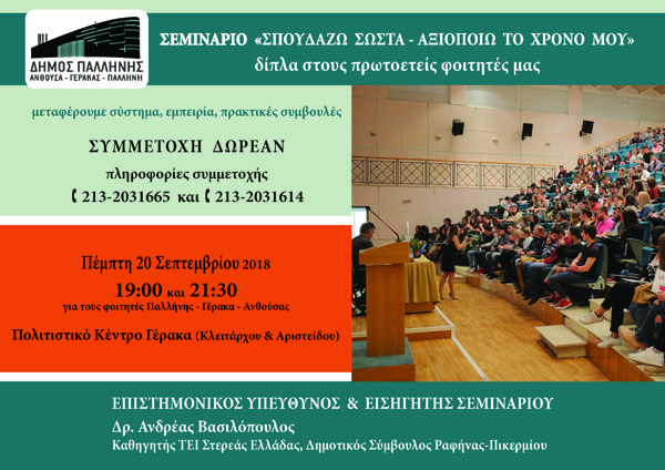 O Δήμος Παλλήνης προσκαλεί τους πρωτοετείς φοιτητές του Δήμου μας, οι οποίοι πέτυχαν, μετά από σπουδαίο αγώνα, την εισαγωγή τους στην Τριτοβάθμια Εκπαίδευση να παρακολουθήσουν το σεμινάριο :