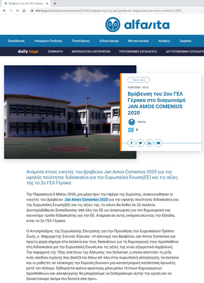 Η εφημερίδας Το ΒΗΜΑ στην ηλεκτρονική της έκδοση www.tovima.gr επεσήμανε τη διάκριση του 2ου ΓΕΛ Γέρακα.