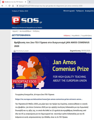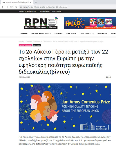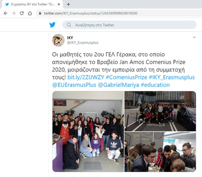 Εντυπώσεις για το Βραβείο Jan Amos Comenius στο 2ο ΓΕΛ Γέρακα