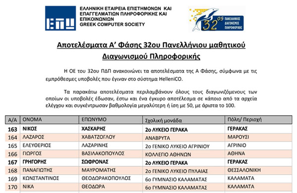 Διάκριση στον 32o Πανελλήνιο Διαγωνισμό Πληροφορικής