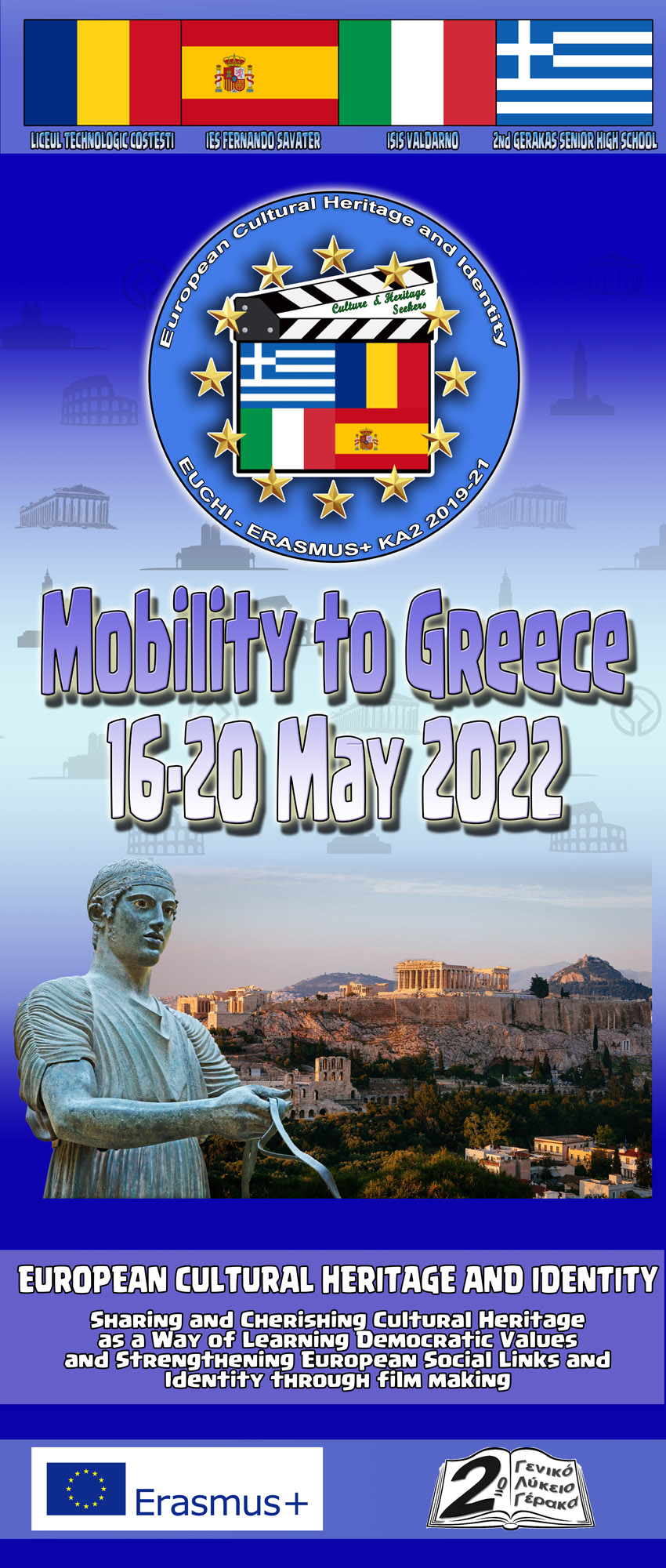 Από την Δευτέρα 16 Μαΐου έως την Παρασκευή 20 Μαΐου 2022 πραγματοποιήθηκε η τελευταία κινητικότητα στην Ελλάδα στο πλαίσιο του προγράμματος ERASMUS+ EUCHI (European Culture, Heritage & Identity). Έλληνες, Ιταλοί, Ρουμάνοι και Ισπανοί μαθητές και καθηγητές ολοκλήρωσαν τις επισκέψεις, που είχαν στόχο την ανακάλυψη του Ευρωπαϊκού Πολιτισμού, της Κληρονομιάς & Ταυτότητάς τους.