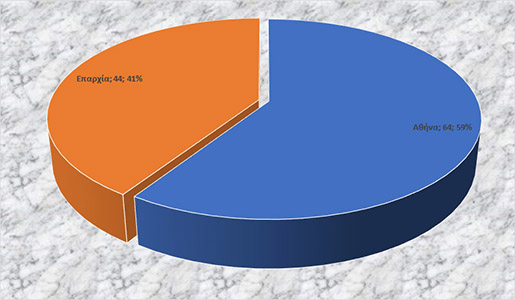 Όσον αφορά την πόλη εισαγωγής, οι 64 (59%) πέρασαν σε σχολές της Αθήνας και οι 44 (41%) στην επαρχία.