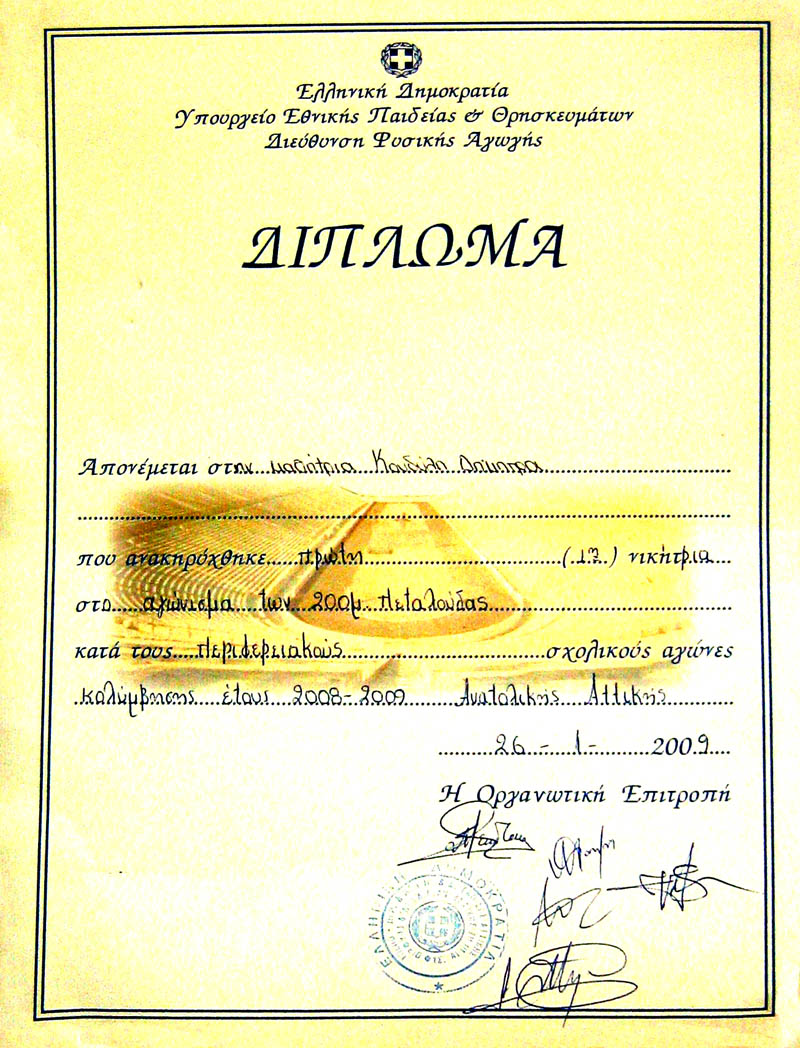 •Δήμητρα Κονδύλη - 1η νικήτρια στα 200 μ. πεταλούδα στους περιφερειακούς σχολικούς αγώνες κολύμβησης 2008-09