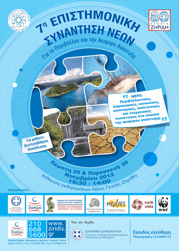 Τo 2o ΓΕΛ Γέρακα συμμετείχε στην 7η Επιστημονική Συνάντηση Νέων για το Περιβάλλον και την Αειφόρο Ανάπτυξη με θέμα: «Νερό: Περιβαλλοντικές, παραγωγικές, κοινωνικές, οικονομικές, πολιτιστικές και ενεργειακές διαστάσεις, στο πλαίσιο της Αειφόρου Ανάπτυξης», που συνδιοργανώθηκε από τη Διεύθυνση Δευτεροβάθμιας Εκπαίδευσης Ανατ. Αττικής και τα Εκπαιδευτήρια Νέα Γενιά Ζηρίδη και υλοποιήθηκε στην Αίθουσα Εκδηλώσεων των Εκπαιδευτηρίων Νέα Γενιά Ζηρίδη την Πέμπτη & Παρασκευή 29 & 30 Νοεμβρίου 2012.