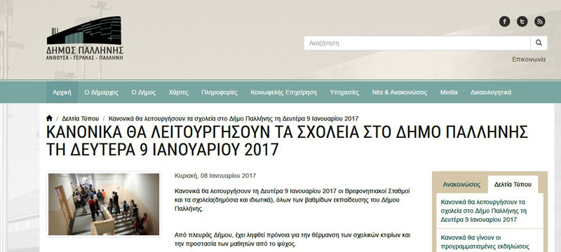 Κανονικά θα λειτουργήσουν τη Δευτέρα 9 Ιανουαρίου 2017 οι Βρεφονηπιακοί Σταθμοί και τα σχολεία(δημόσια και ιδιωτικά), όλων των βαθμίδων εκπαίδευσης του Δήμου Παλλήνης.