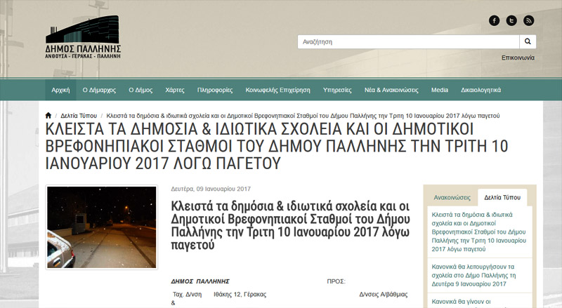 ΔΗΜΟΣ ΠΑΛΛΗΝΗΣ ΠΡΟΣ: Ταχ. Δ/νση Ιθάκης 12, Γέρακας Δ/νσεις Α/βάθμιας & Β/θμιας Εκπαίδευσης Ταχ. Κώδικας 15344 Τηλ 210-6604663-4 FAX 210-6612965 Email press@palini.gr ΘΕΜΑ: Διακοπή μαθημάτων σε σχολεία και βρεφονηπιακούς σταθμούς του Δήμου Παλλήνης, λόγω παγετού.ΑΠΟΦΑΣΗ Ο ΔΗΜΑΡΧΟΣ ΠΑΛΛΗΝΗΣ Έχοντας υπόψη: - Το άρθρο 75 παρ. 1 περιπτ. στ. υποπερίπτωση 27 του Ν. 3463/2006, όπως συμπληρώθηκε με το άρθρο 94 του Ν. 3852/2010. - Την παρ. 1 του άρθρου 282 του Ν. 3852/2010. - Τις διατάξεις του άρθρου 5 του Π.Δ. 200/1998 και του άρθρου 5 του Π.Δ. 201/1998 - Την πρόβλεψη της Μετεωρολογικής Υπηρεσίας για επικράτηση χαμηλών θερμοκρασιών μετά από έντονη χιονόπτωση που δημιουργεί συνθήκες παγετού στο οδικό δίκτυο του Δήμου και καθιστά δυσχερή και επικίνδυνη την κυκλοφορία στους δρόμους, στα πεζοδρόμια και στους ελεύθερους χώρους των Σχολείων. - Την ανάγκη να προφυλαχθούν οι μαθητές και οι γονείς κατά την προσέλευση στα σχολεία από την επικινδυνότητα των οδοστρωμάτων.ΑΠΟΦΑΣΙΖΟΥΜΕ Τη διακοπή των μαθημάτων την Τρίτη 10/01/2017 σε όλα τα Δημόσια και Ιδιωτικά Σχολεία Α/βάθμιας και Β/βάθμιας εκπαίδευσης που βρίσκονται εντός των διοικητικών ορίων του Δήμου Παλλήνης, καθώς και όλων των παιδικών και βρεφονηπιακών σταθμών του Δήμου Παλλήνης, προκειμένου να προφυλαχθούν μαθητές και γονείς από την άνω κατάσταση των οδοστρωμάτων, που καθιστά επικίνδυνη την προσέλευσή τους στα εν λόγω σχολεία και παιδικούς σταθμούς.Ο ΔΗΜΑΡΧΟΣ ΑΘΑΝΑΣΙΟΣ ΖΟΥΤΣΟΣ