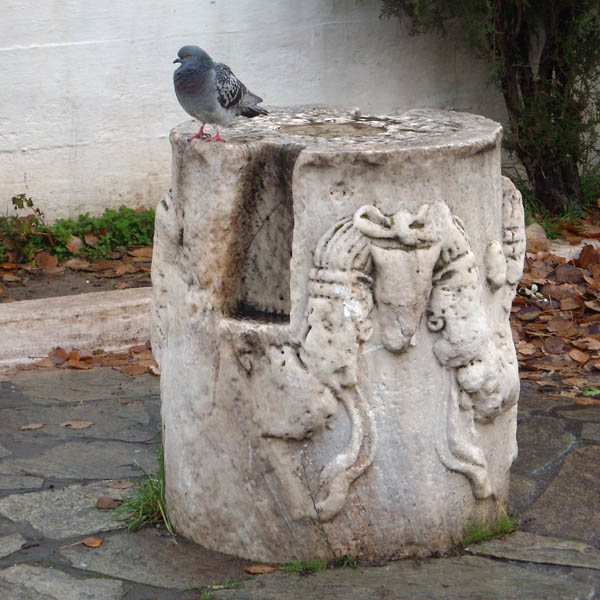 Μπορούμε να δούμε επίσης μαρμάρινο τμήμα κίονα με ανάγλυφες παραστάσεις.